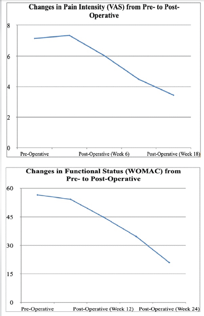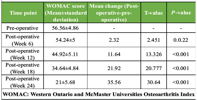 Table 3: Changes in functional status (WOMAC) from pre- to post-operative