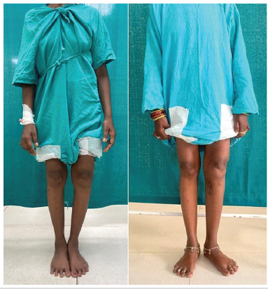 Figure 2: Clinical photographs of the patient in the standing position. (a) Pre-operative image showing bilateral varus knee alignment. (b) 4 months post-operative image demonstrating correction of lower limb mechanical axis following medial open-wedge high tibial osteotomy (left knee)