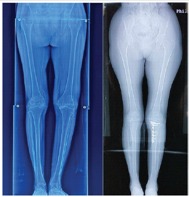 Figure 4: Standing long-leg radiographs of the lower limbs. (a) Pre-operative radiograph showing varus mechanical axis deviation. (b) Post-operative radiograph demonstrating correction of the mechanical axis now passing through the Fujisawa point (left knee).