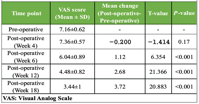 Pain intensity was assessed by VAS at baseline and at specified post-operative intervals (4, 6, 12, and 18 weeks). At 4 weeks postoperatively, the mean VAS was 7.36 ± 0.57, with a mean change of –0.20 from baseline (P = 0.170). By 6 weeks postoperatively, the mean VAS score had decreased to 6.04 ± 0.89, representing a mean improvement of 1.12 points compared to baseline (P < 0.001) [9,10]. Subsequent assessments at 12 and 18 weeks showed continued and progressive pain relief. At 12 weeks, the mean VAS was 4.48 ± 0.82 (mean change 2.68; P < 0.001), and by 18 weeks, the mean VAS further decreased to 3.44 ± 1.00 (mean change 3.72; P < 0.001) (Table 2).