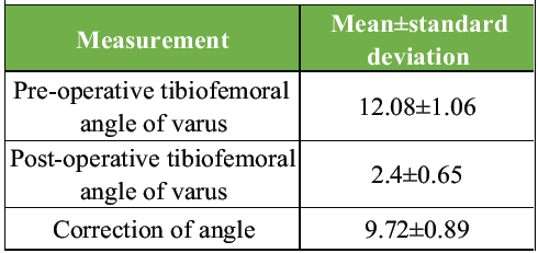 Pre-operative correction planning was performed using the Miniaci method, as originally described by Miniaci et al., which enables precise calculation of the required wedge opening by projecting the mechanical weight-bearing axis through the Fujisawa point and determining the hinge-based angular correction. The intended post-operative mechanical axis was targeted to pass approximately 62.5% lateral to the tibial plateau width. In our series, the achieved mean post-operative varus angle was 2.4 ± 0.65°, closely approximating the planned correction and thereby confirming the reliability and reproducibility of the Miniaci technique in achieving accurate alignment. [4,17] Though we did not use bone substitutes or wedges in our series, several authors have reported satisfactory union rates and maintenance of correction with their use in open-wedge high tibial osteotomy. [18]