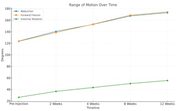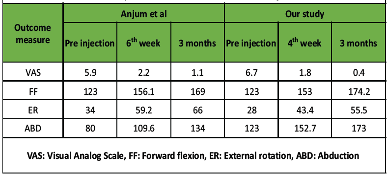 In this prospective study, we observed significant early and sustained improvements in pain, ROM, and functional outcomes following clinico-radiologically predetermined, landmark-based, patient-specific multisite steroid injection combined with a structured physiotherapy protocol in patients with primary FS. Meaningful reductions in VAS scores and improvements in ASES, SPADI, and shoulder ROM were evident as early as 2 weeks post-intervention and continued to improve over the 12-week follow-up period. The treatment modality employed in the present study differs fundamentally from the routine intra-articular steroid injection commonly used in the management of FS. Conventional practice typically involves a single-site intra-articular injection targeting the glenohumeral joint, based on the assumption that the pathology is confined to capsular inflammation. However, FS is increasingly recognized as a condition involving inflammation of multiple periarticular structures, including the subacromial bursa, rotator interval, coracohumeral ligament, and the biceps tendon sheath. Our approach utilizes a patient-specific multisite steroid injection strategy guided by focused clinical examination and ultrasound findings, targeting both intra-articular and extra-articular pain generators in a single sitting. By addressing multiple sources of inflammation simultaneously, this technique aims to achieve more comprehensive pain relief, facilitate earlier participation in physiotherapy, and promote faster functional recovery compared to routine single-site intra-articular steroid injections. In the quest for the ideal treatment for FS, different steroids, injection sites, techniques, and frequency of injection have been studied. As reported by the Consensus Survey of Shoulder Specialists, conservative management remains the most popular as the first line of treatment, and 63% of participants agreed that steroids have a beneficial role [1]. However, despite the abundance of therapeutic modalities, there remains a paucity of guidelines regarding the treatment ladder in the management of FS. There is no definitive guideline as to when to change from one treatment modality to another. However, it is generally acceptable to wait for 3 months before declaring any conservative treatment ineffective [18]. The choice of betamethasone for our study is supported by its high potency (more than 6 times that of triamcinolone) and long half-life of 8.5 days [19]. Furthermore, its solubility reduces its propensity to crystallize, a process which has been incriminated in post-steroid flare reactions [20]. With regards to the injection technique, our decision to opt for the anterior approach is supported by Deng et al., who reported that a decrease in VAS was consistently better at each follow-up and the improvements in functional scores and external rotation were faster and more significant when using the anterior approach rather than a posterior approach for intra articular steroid injection in FS [21]. Another area of variability in practice is the use of ultrasound-guided (US-guided) versus landmark-based steroid injections. While the accuracy of US-guided injections is higher (90% versus 76.2%), this difference was not found to be statistically significant in a cohort study of 41 patients by Raeissadat et al. Improvements in pain, functional scores, and ROM (except for extension), albeit more in the US-Guided group, failed to reach statistical significance [22]. The lack of significant clinical benefit of US-guided compared to landmark-based steroid injections was echoed by a Cochrane study, which concluded that there was no advantage in terms of pain, function, shoulder ROM, or safety in using the former technique [23]. Rather more evident was the fact that US-guided injections would be more costly and time-consuming [22]. We have strived to base our practice on the best available evidence and robust scientific reasoning, but the ultimate litmus test remained our results. The mean VAS score decreased from a pre-injection value of 6.7–0.7. This improvement was significantly greater than that achieved by Song et al., who treated their patients with US-guided triamcinolone injections and reported a mean VAS score reduction from 5.6 to 3.0 [24]. Interestingly, this reduction occurred over a mean of 2.1 months, whereas our results demonstrate a comparable VAS of 3.5 at a mere 2 weeks and a VAS of 1.8 at 4 weeks only. Anjum et al., [25] evaluated the efficacy of a single intra-articular injection of methylprednisolone combined with physiotherapy and physiotherapy alone. The authors concluded that the results were significantly better in the combination group. The mean VAS score in the combination group decreased to 1.1 from 5.9 at 3 months. The VAS score had reached 2.2 by 6 weeks post-injection. The mean SPADI score improved from 62.5 to 33.0 at 6 weeks and 18.9 at 3 months in his patients, compared to 86.8 at pre-injection to 18.5 at 3 months in our study. They also reported a mean increase in internal rotation by 7 levels by 6 weeks and 9 levels by 3 months compared to an improvement of 4 levels by 3 months (Table 5). An explanation for this discrepancy could be the fact that their patients overall had a more significantly reduced internal rotation than our patients – the mean internal rotation was S3, whereas the most severely restricted internal rotation was S1 in our study group.
