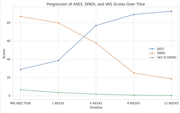 Graph 2: Functional outcomes and Visual Analog Scale scores at pre-injection and post-injection visits.