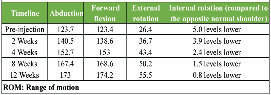Table 2: Results of ROM at pre-injection and post-injection visits