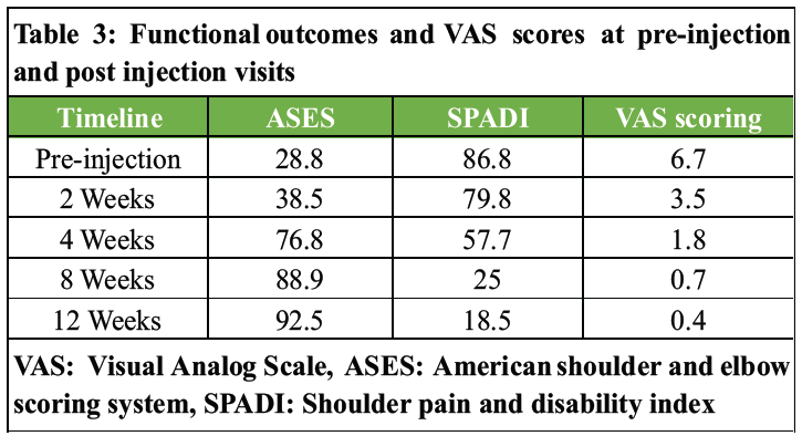 Table 3: Functional outcomes and VAS scores at pre-injection and post injection visits