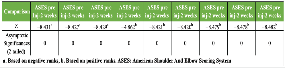 The differences in ROM, VAS, and functional outcomes between pre-injection status and during post-injection visits were assessed using the paired samples test, while the statistical significance of these differences was evaluated by the Wilcoxon signed-rank test (Table 4).