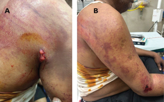 Figure 1: (a) Clinical image showing an open laceration over the axillary region with surrounding ecchymosis and swelling. (b) Extensive bruising and swelling of the upper limb extending from the shoulder to the elbow, consistent with underlying soft tissue trauma and subcutaneous emphysema.