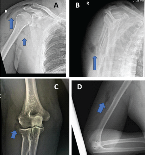 Figure 2: Plain radiographs of the right upper limb. (a) Anteroposterior (AP) view of the shoulder showing air lucencies in the soft tissue planes around the scapula and proximal arm (blue arrows), suggestive of subcutaneous emphysema. (b) Scapular Y-view demonstrating subcutaneous air in the axillary region (blue arrow). (c) AP view of the elbow showing air shadows in the subcutaneous tissue overlying the distal humerus (blue arrow). (d) Lateral view of the elbow confirming subcutaneous emphysema in the posterior soft tissue planes (blue arrow).