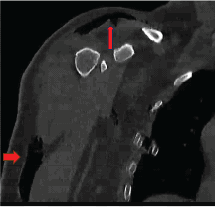 To evaluate the full extent of soft tissue air and rule out deeper involvement, a contrast-enhanced computed tomography (CT) scan of the thorax and shoulder was performed. It confirmed the presence of SE confined to the soft tissues of the axilla and upper arm (Fig. 3). There was no extension into the pleural cavity, no pneumomediastinum, and no vascular or pulmonary parenchymal injuries. The scapular body fracture was confirmed to be minimally displaced and extra-articular.