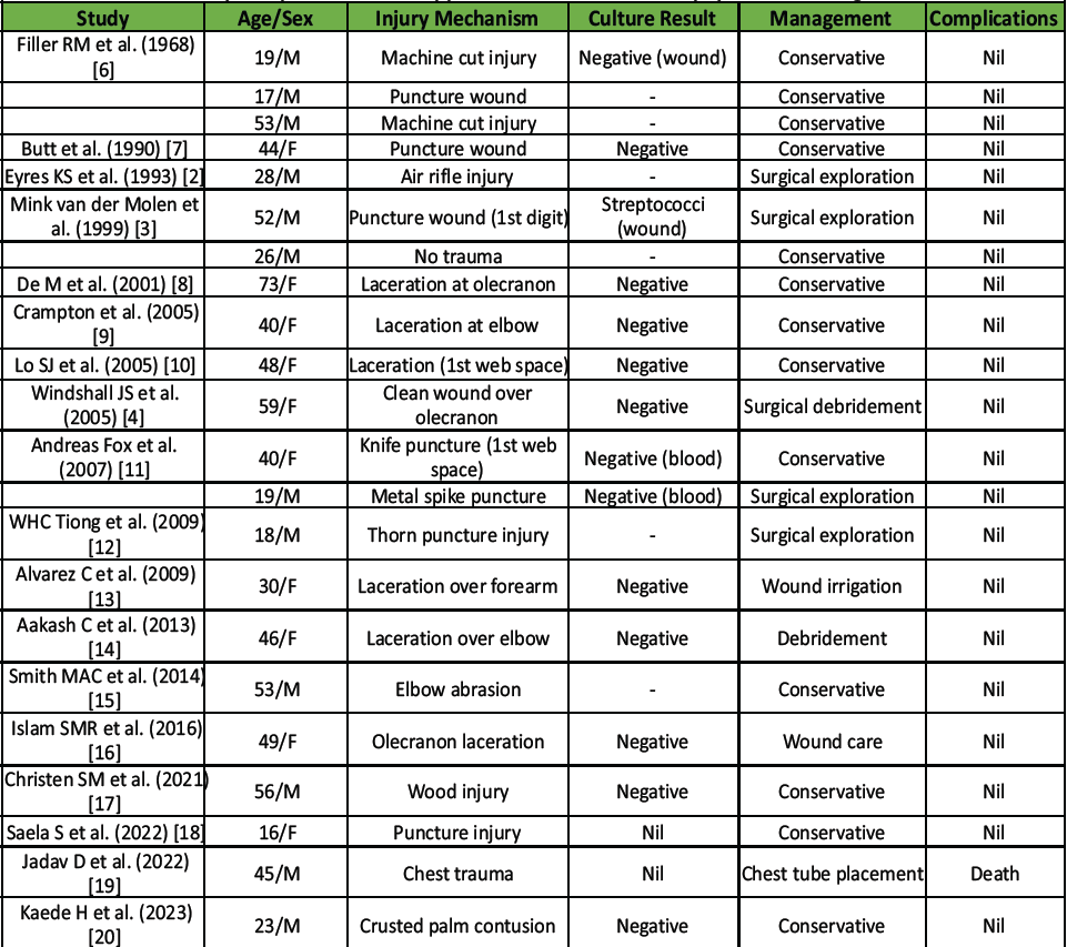 Table 1: Summary of reported cases of upper -limb subcutaneous emphysema following minor trauma