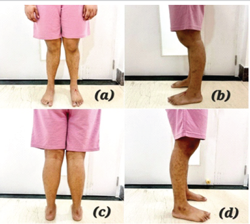 Figure 1: Clinical photographs showing the patient’s knee alignment and deformity before surgery. (a) Anterior view demonstrating valgus alignment with hyperextension; (b) Lateral view showing knee hyperextension (recurvatum deformity); (c) Posterior view illustrating leg alignment and calf contour; (d) Oblique lateral view highlighting knee posture and recurvatum.