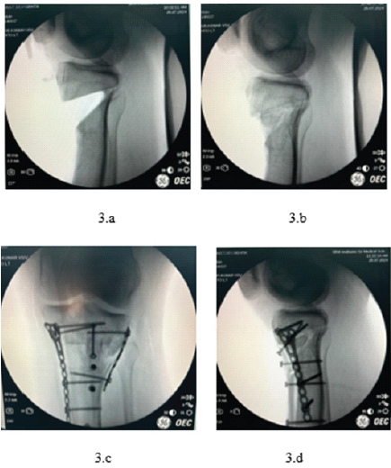 Figure 3: Intraoperative fluoroscopic images illustrating osteotomy and fixation stages. (a) Lateral view after completion of biplanar tibial tuberosity osteotomy, before graft placement and fixation; (b) Anteroposterior view after osteotomy, showing gap created for graft insertion; (c) Anteroposterior view following final implant fixation with tricortical graft in place; (d) Lateral view following dual-pillar plate fixation and tibial tuberosity screw placement.