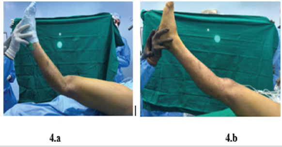 Figure 4: Intraoperative clinical images demonstrating correction of knee hyperextension. (a) Pre-correction positioning showing excessive knee hyperextension. (b) Post-correction positioning illustrating restored knee flexion and alignment.
