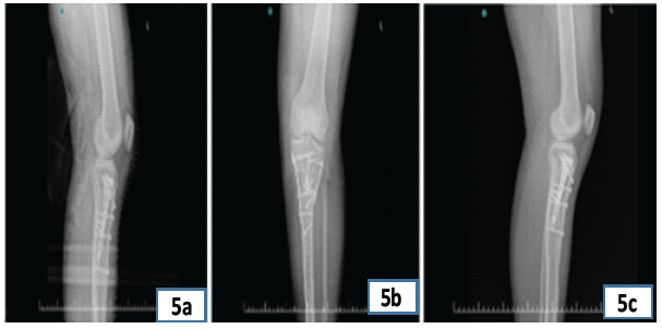 Figure 5: Postoperative radiographic images demonstrating implant position and bone healing. (a) Lateral radiograph showing fixed biplanar osteotomy with maintained alignment and implant stability; (b) Anteroposterior radiograph illustrating well-aligned knee joint and stable fixation with plates and screws; (c) Oblique radiograph highlighting bone graft incorporation and hardware position.