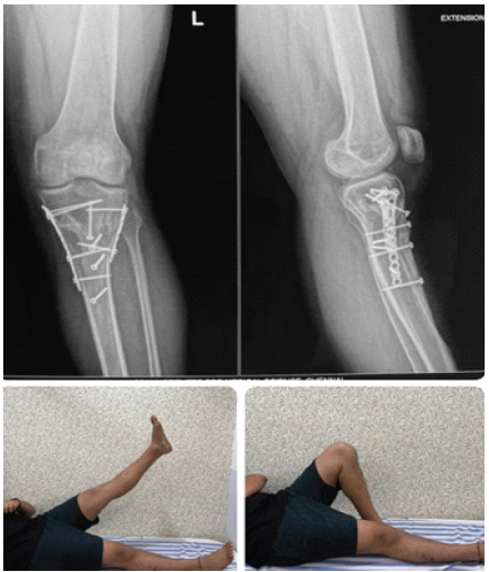 In Fig. 6, the fixation appears stable in both anteroposterior and lateral views, showing appropriate alignment. The lower photographs show the patient performing active knee and hip mobilization exercises as part of post-operative rehabilitation.