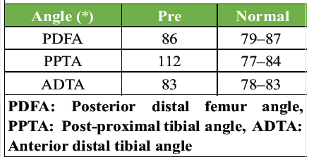 In Table 1, using TRAUMACAD SOFTWARE, angle lines are drawn pre-operative in the AP lower-limb scanogram medial proximal tibial angle (90) and lateral distal femur angle (87) which are in the physiological range, whereas the lateral lower-limb scanogram measurement shows posterior distal femur angle (PDFA – 86°), post proximal tibial angle is 112° (PPTA – 112°), and anterior distal tibial angle is 83° (ADTA – 83°). These angles and measurements show that deformity is in the proximal tibia, recurvatum deformity with center of rotation of angulation (CORA) at the level of the proximal tibia.
