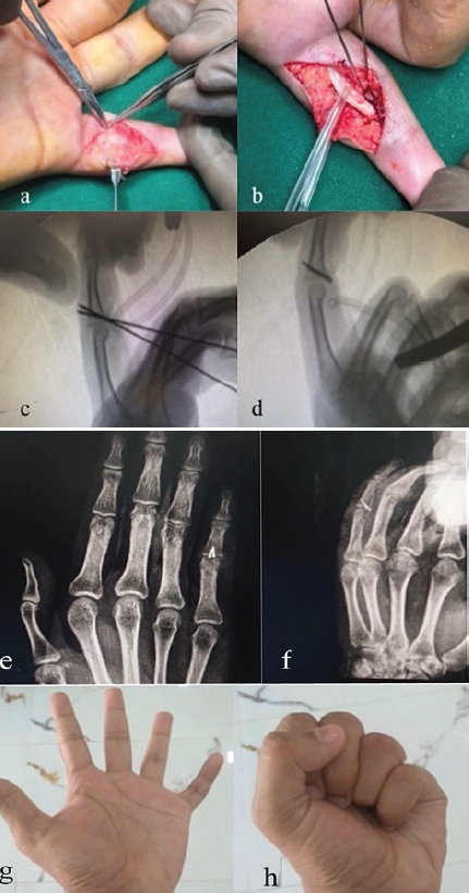 Figure 2: Intra-Operative Clinical Pictures, C-Arm Shoots, Post Operative X-Rays & Follow Up ROM Clinical Picture (a) Volar Incision Taken Over Little Finger, (b) Flexor Tendon Retracted, K-wires placed, (c) C-arm shoot showing K-Wires, (d) C-arm shoot showing Mini-Screws, (e) Post-Operative X-Ray Left Hand AP View, (f) Post-Operative X-Ray Left Hand Oblique View, (g) 6 weeks Follow Up Image showing Finger Extension, (h) 6 weeks Follow Up Image showing Finger Flexion