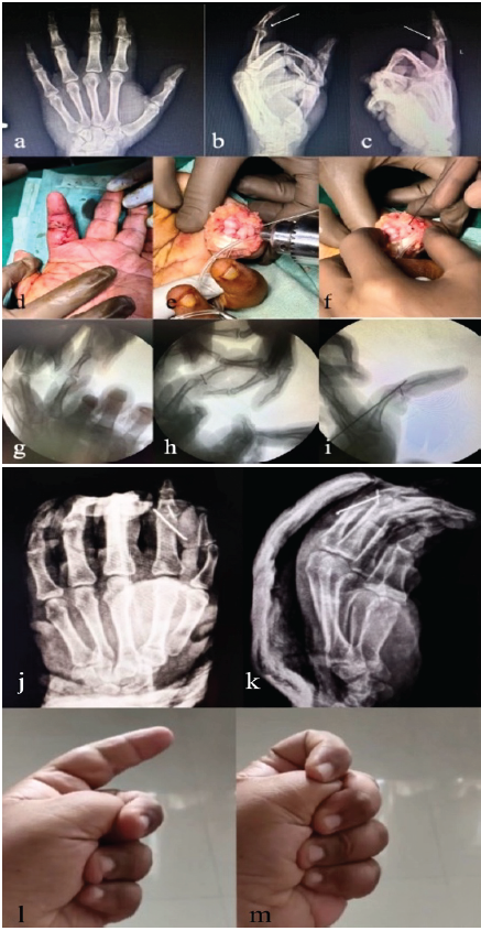 Figure 3: Pre-Operative X-Rays, Intra-Operative Clinical Pictures, C-Arm Shoots, Post Operative X-Rays & Follow Up Clinical Pictures (a) Pre-Operative X-Ray Left Hand AP View, {(b), (c)} Pre-Operative X-Ray Left Index Finger Lateral, (d)Incision at volar aspect of Left Index Finger, {(e), (f)} Intra-Op Image showing Shotgun Approach, (g) C-Arm Shoot showing Index Finger, (h) C – arm Shoot showing mini-screw over the volar lip, (i) C-Arm Shoot showing mini-screw over volar lip and K-wire acting as extension block, (j) Post-Operative X-Rays X-Ray Left Hand AP View, (k) Post-Operative X-Rays X-Ray Left Hand Oblique View, (l) 6 weeks Follow Up Image showing Finger Extension, (m) 6 weeks Follow Up Image showing Finger Flexion