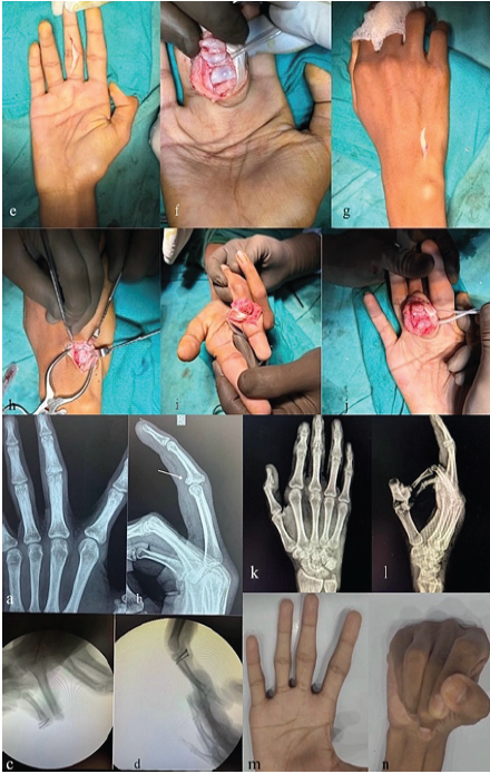 Figure 4: Pre-Operative X-Rays, Intra-Operative C-Arm Shoots, Clinical Pictures, Post Operative X-Rays & 6 Weeks Follow Up ROM Clinical Pictures (a) X-Ray Right Hand AP View, (b) X-Ray Right third finger Lateral View, {(c), (d)} C-arm shoots showing autograft fixed with mini screws, (e) Incision over Volar aspect of third finger, (f) shotgun approach, (g) incision & exposure over dorsal aspect for hemi-hamate autograft, {(i),(j)} fixation of autograft with help of mini screws, (k) Post Operative X-Ray Right Hand AP View, (l)Post Operative X-Ray Right third finger Lateral View, (m) 6 Weeks Follow Up Image showing Finger Extension, (n) 6 Weeks Follow Up Image showing Finger Flexion