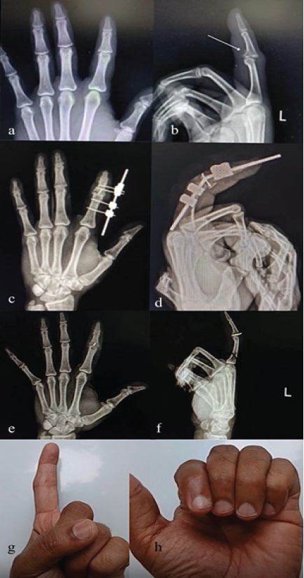 Figure 5: Pre Operative & Post Operative X-Rays, Post Jess Fixator Removal X-Rays & 6 Weeks Follow Up ROM Clinical Pictures (a) X-Ray Left Hand AP View, (b) X-Ray Left Index Finger Lateral View, (c) X-Ray Left Hand AP View showing Jess Fixator, (d) X-Ray Left Index Finger Lateral View, (e) Post Jess Fixator Removal X-Ray Left Hand AP View, (f) Post Jess Fixator Removal X-Ray Left Index Finger Lateral View, (g) Follow Up Image showing Finger Extension, (h) Follow Up Image showing Finger Flexion