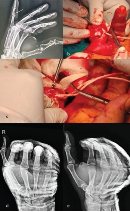 Figure 6: Pre Operative Xray, Intra-Operative Clinical Pictures & Post Operative X-Rays (a) X-Ray Right little Finger Lateral View, (b) Intra-Operative Clinical Picture Showing Shotgun Approach, (c) Intra-Operative Clinical Picture Showing mini-screw fixation, (d) Post Operative X-Ray Right Hand AP View, (e) Post Operative X-Ray Right Hand Oblique View