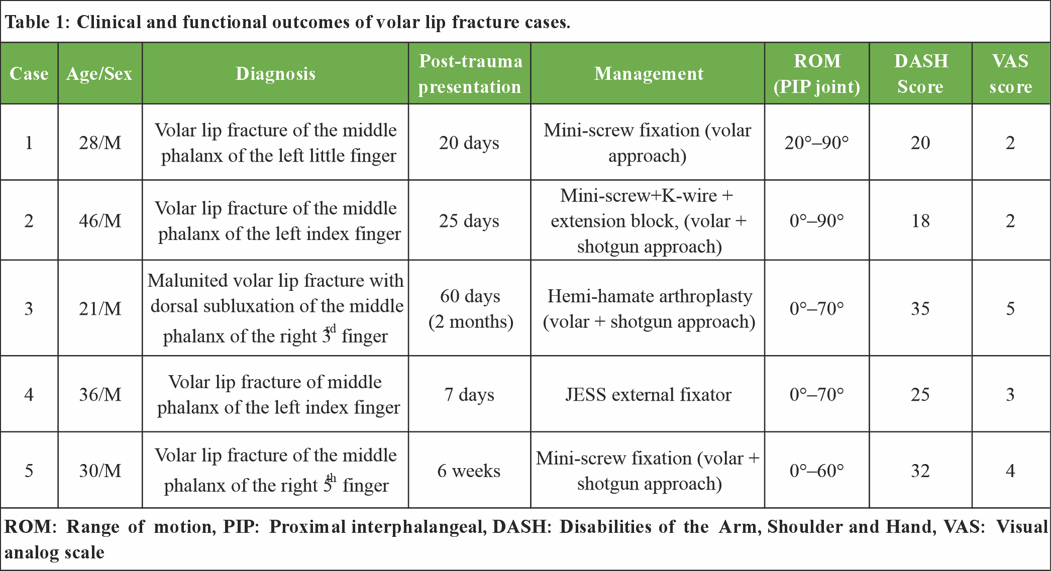 Case Series: This series reports five cases of volar lip fractures of the middle phalanx presenting at variable intervals and managed with variable surgical techniques at a tertiary care center which includes: (1) Mini-screw fixation in acute case, (2) mini-screw fixation combined with K-wire stabilization, (3) hemi-hamate arthroplasty, (4) JESS external fixation, (5) mini-screw fixation in a chronic case. Post-operative care included protective splinting for 2–4 weeks, suture removal at 2–3 weeks, and initiation of mobilization with strapping, followed by structured physiotherapy. Comparative analysis revealed that acute cases (Cases 1, 2, and 4) achieved superior outcomes with primary fixation techniques, showing better post-operative proximal interphalangeal joint range of motion, lower Disabilities of the Arm, Shoulder and Hand (DASH) scores, and lower Visual Analog Scale (VAS) pain scores. Chronic cases (Cases 3 and 5) required reconstructive or delayed fixation, yielding restricted motion, higher DASH scores, and higher VAS scores.