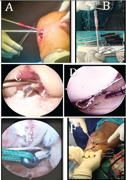 Figure 1: (a) Semitendinosus graft harvesting. (b) Quadrupling of semitendinosus graft. (c) Tibial tunneling. (d) All inside repair of meniscus. (e) Shuttling of graft with the Endo button. (f) Tibial fixation of anterior cruciate ligament reconstruction with interference screw.