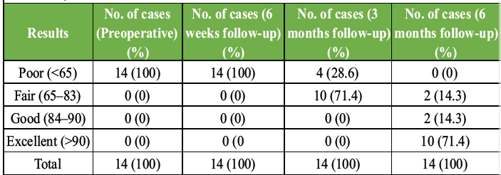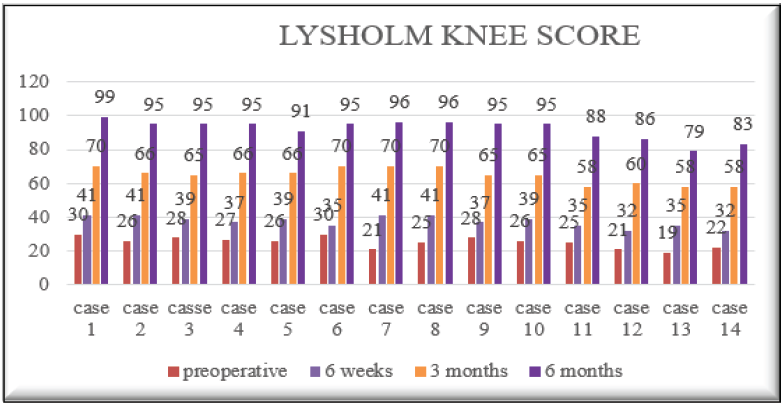 Pre-operatively, all 14 patients (100%) had poor Lysholm scores (mean 25.2). At 6 weeks, patients remained in the poor category (mean 37.4). By 3 months, 71.4% improved to fair and 28.6% remained poor (mean 64.7). At 6 months, no patient was poor; 71.4% achieved excellent, 14.3% good, and 14.3% fair outcomes, with a mean Lysholm Score of 92, indicating substantial functional recovery. A statistical comparison between pre-operative and 6-month follow-up Lysholm Scores using a paired t-test revealed a highly significant difference (t = 62.88, P < 0.0000000000000000154/P < 1.54 × 10⁻17), indicating that the observed improvement in knee function was statistically significant.(Table 5)