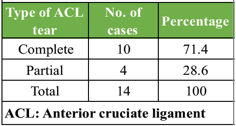In our study, 10 out of 14 patients (71.4%) experienced a complete ACL tear, while the remaining 4 patients (28.6%) had a partial tear (Table 3).