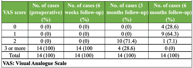 VAS scores showed progressive improvement post-operatively. The mean score decreased from 4 pre-operatively to 3.3 at 6 weeks, 2.2 at 3 months, and 0.8 at 6 months. By final follow-up, 92.9% of patients reported minimal or no pain (VAS 0–1), with no patient scoring ≥3 (image 2). A paired t-test comparing pre-operative and 6-month follow-up VAS scores demonstrated a statistically significant reduction in pain levels (t = 25.24, P = 0.00000000000198/P < 1.98 × 10⁻12), indicating that the improvement in VAS scores was highly significant. (Table 6)