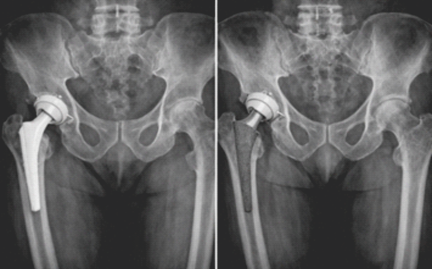 Figure 1: Anteroposterior pelvic radiograph comparing a cemented femoral stem (left) to a cementless femoral stem in direct bone contact (right).