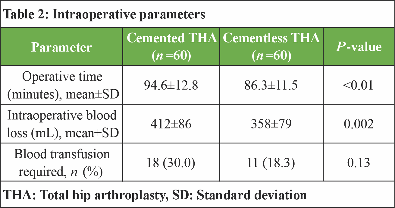 Mean operative duration was significantly longer in the cemented THA group compared with the cementless group (94.6 ± 12.8 minutes vs. 86.3 ± 11.5 min, P < 0.01). Intraoperative blood loss was also higher in patients receiving cemented fixation (412 ± 86 mL vs. 358 ± 79 mL, P = 0.002). Although a greater proportion of patients in the cemented group required perioperative blood transfusion, this difference did not reach statistical significance (Table 2).