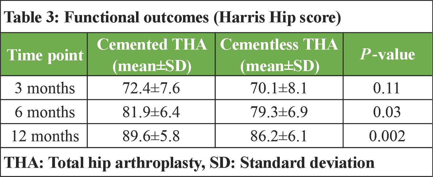 Both groups demonstrated progressive improvement in functional outcomes over time. At 3 months postoperatively, the mean HHS was comparable between the cemented and cementless THA groups (72.4 ± 7.6 vs. 70.1 ± 8.1, P = 0.11). At 6 months, patients in the cemented group showed significantly higher scores (81.9 ± 6.4 vs. 79.3 ± 6.9, P = 0.03). This difference persisted at 12 months, with the cemented THA group achieving a superior mean HHS (89.6 ± 5.8 vs. 86.2 ± 6.1, P = 0.002) (Table 3).