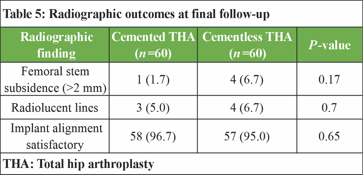 - 6. Rocha AC, Somerville LE, Moody PW, Lanting BA, Howard JL, Naudie DD, et al. Cementless versus cemented stems in patients aged 70 years or older undergoing total hip arthroplasty. J Arthroplasty 2025;40:S250-4. [Google Scholar] [PubMed]