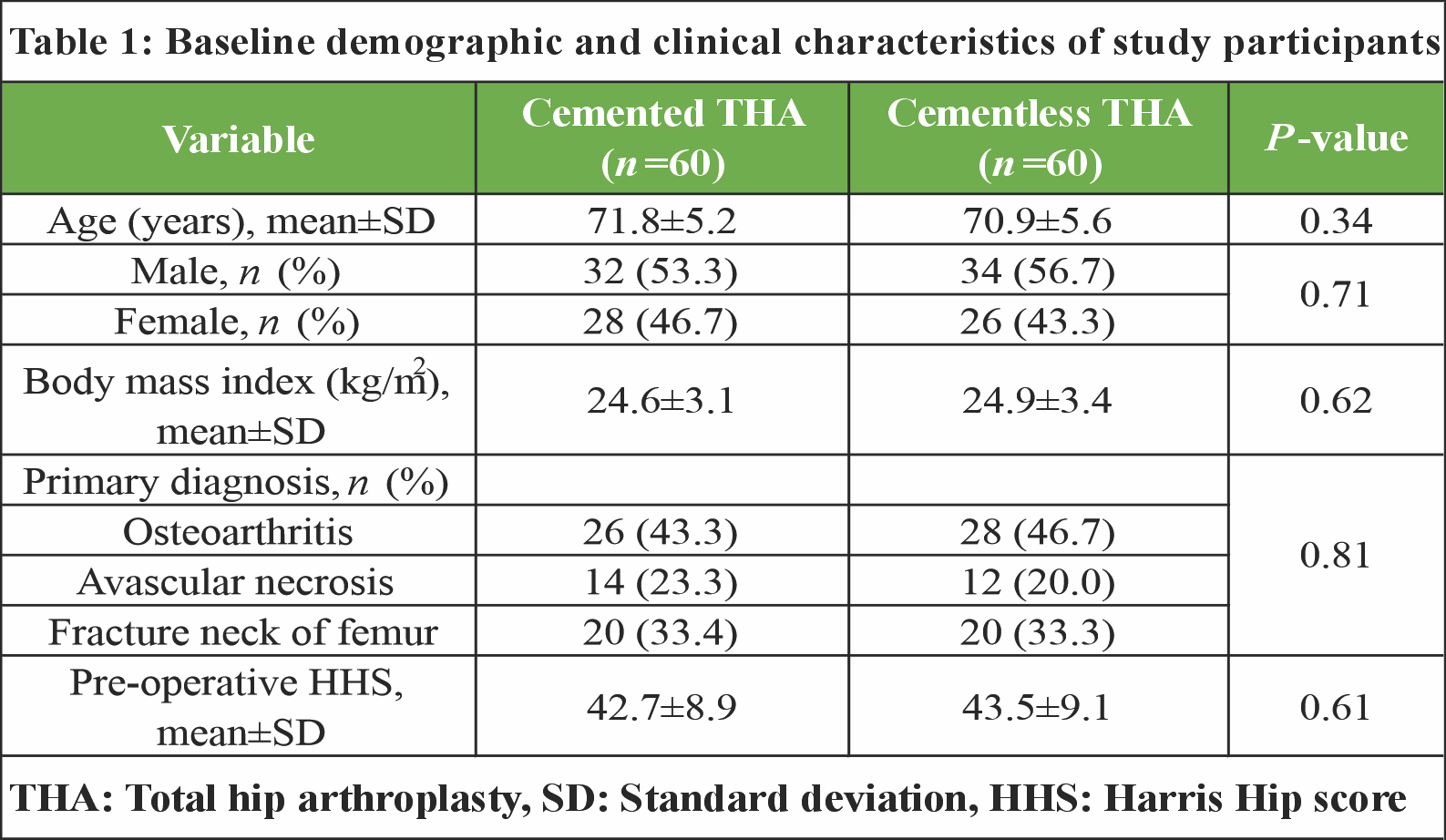 The two groups were comparable with respect to baseline demographic and clinical variables. Mean age was 71.8 ± 5.2 years in the cemented group and 70.9 ± 5.6 years in the cementless group (P = 0.34). Sex distribution, body mass index, primary indication for surgery, and pre-operative HHS did not differ significantly between groups (Table 1).