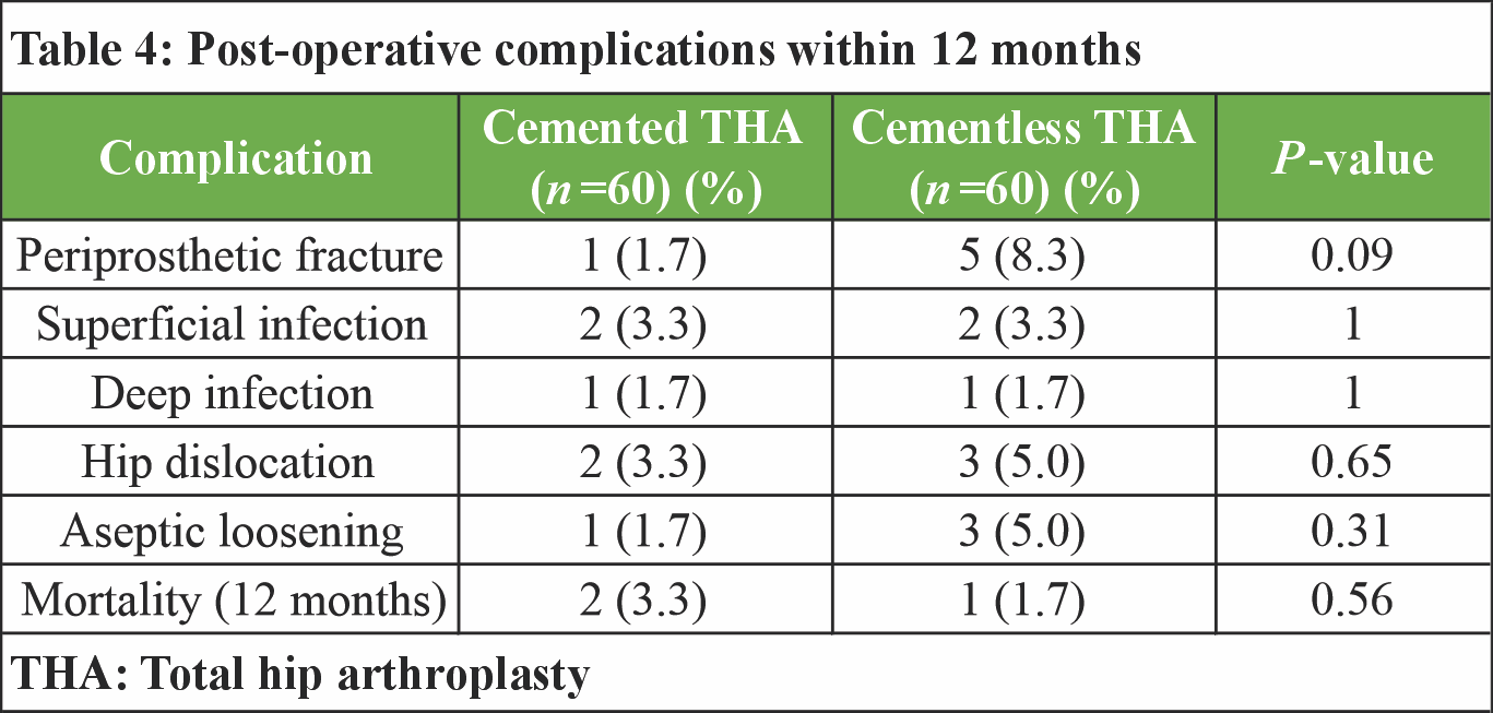 The overall incidence of post-operative complications within 12 months was low in both groups. Periprosthetic fractures occurred more frequently in the cementless THA group; however, this difference was not statistically significant. Rates of superficial and deep infection, hip dislocation, aseptic loosening, and 12-month mortality were comparable between the two cohorts, with no statistically significant differences observed (Table 4).