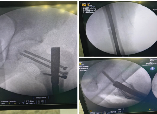 Patient was hemodynamically stable with Blood pressure of 130/80 mmhg and saturation of 97% on room air. Any other injury was ruled out and he was then admitted in Goa Medical College on June 17, 2025. Investigations revealed low hemoglobin of 9.2 g/dL; the rest of the investigations, including Renal and liver function tests, were normal. Computed tomography pulmonary angiography was done to rule out pulmonary embolism and was found to be normal. He was kept on 4L oxygen with a facemask and low molecular weight heparin till the operation. After omitting heparin 12 h before the surgery, the patient was then taken to OT on June 21, 2025 under combined epidural and spinal anesthesia. Two important things, which had to be addressed: First, to reduce distraction at the shaft fracture and second, the neck fracture. The patient was positioned on a traction table. The same incision was used. First, the femur nail tip was felt and identified and then the femur jig was connected to it. Then, both the proximal bolts were removed to backslap the nail till the fracture site gap of the shaft got reduced, and then only the proximal dynamic bolt was put. Now, for neck fracture, two 6.5 mm Cannulated Cancellous screws (one with a washer) were passed from the neck to the head of the femur. Both the screws have to be put in the posterior quadrant as the entry of the femur nail was found to be a little anterior. Good compression was achieved at both the fracture sites (Figs. 3 and 4).
