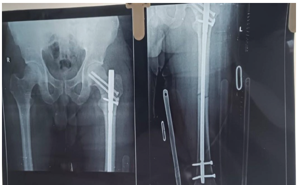 Post-operatively patient was started with knee range of motion, bed-side sitting, and non-weight bearing with a walker. Serial X-rays were taken and it showed Good union at both the fracture site and NO avascular necrosis (AVN) changes in the head of the femur. After 2 months, the patient was advised to follow weight-bearing mobilization with the help of a walking cane and to continue knee and hip strengthening exercises. Patient is symptomatically better and has minimal pain over the operated limb.