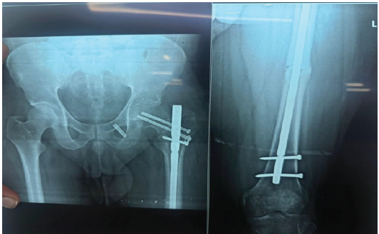 Figure 4: Immediate post-operative radiograph after the second surgery of the hip and full-length femur anteroposterior view showing miss-a-nail compression screws for the neck femur with fracture distraction reduced at the shaft.