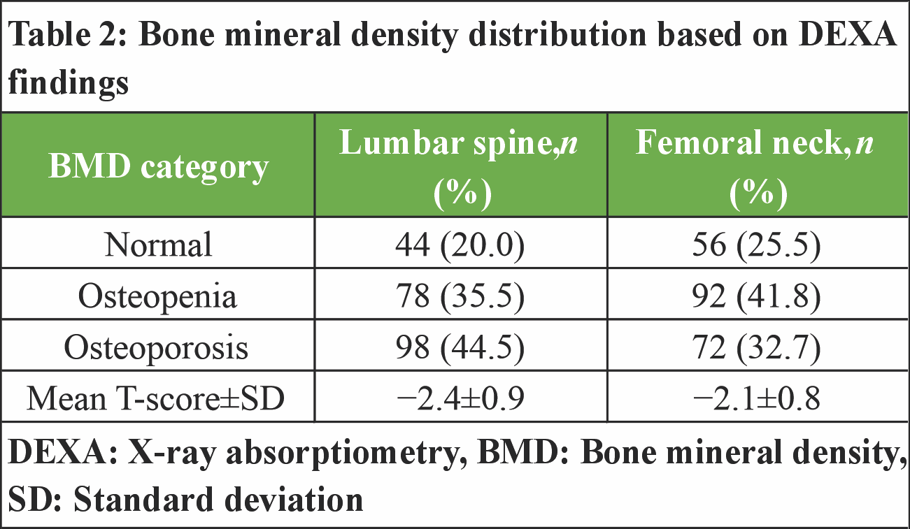 BMD was assessed using dual-energy X-ray absorptiometry (DEXA) at the lumbar spine (L1-L4) and femoral neck. Results were expressed as T-scores and categorized as normal, osteopenia, or osteoporosis based on established diagnostic criteria.