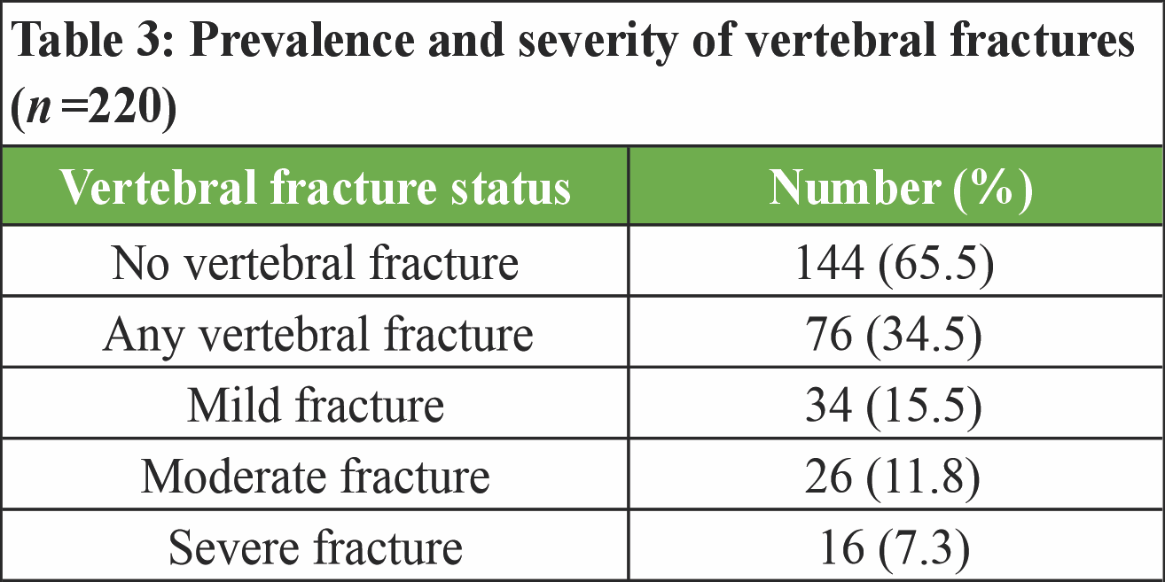 Radiographic assessment demonstrated that 76 women (34.5%) had at least one vertebral fracture. Of these, 15.5% were classified as mild, 11.8% as moderate, and 7.3% as severe fractures. The remaining 65.5% of participants showed no radiological evidence of vertebral fracture (Table 3).