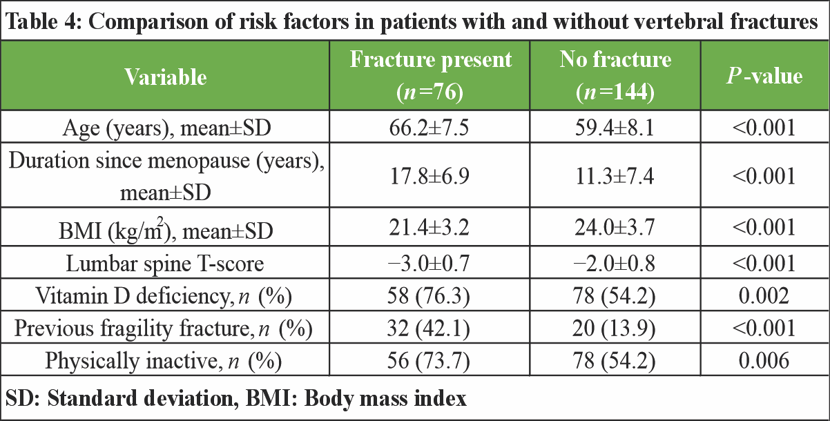 Participants with vertebral fractures were significantly older than those without fractures (66.2 ± 7.5 vs. 59.4 ± 8.1 years; P < 0.001) and had a longer duration since menopause (17.8 ± 6.9 vs. 11.3 ± 7.4 years; P < 0.001). Mean BMI was significantly lower in the fracture group (21.4 ± 3.2 kg/m2) compared with the non-fracture group (24.0 ± 3.7 kg/m2; P < 0.001). Lumbar spine BMD was also substantially reduced among women with fractures, with a mean T-score of −3.0 ± 0.7 versus −2.0 ± 0.8 in those without fractures (P < 0.001) (Table 4).