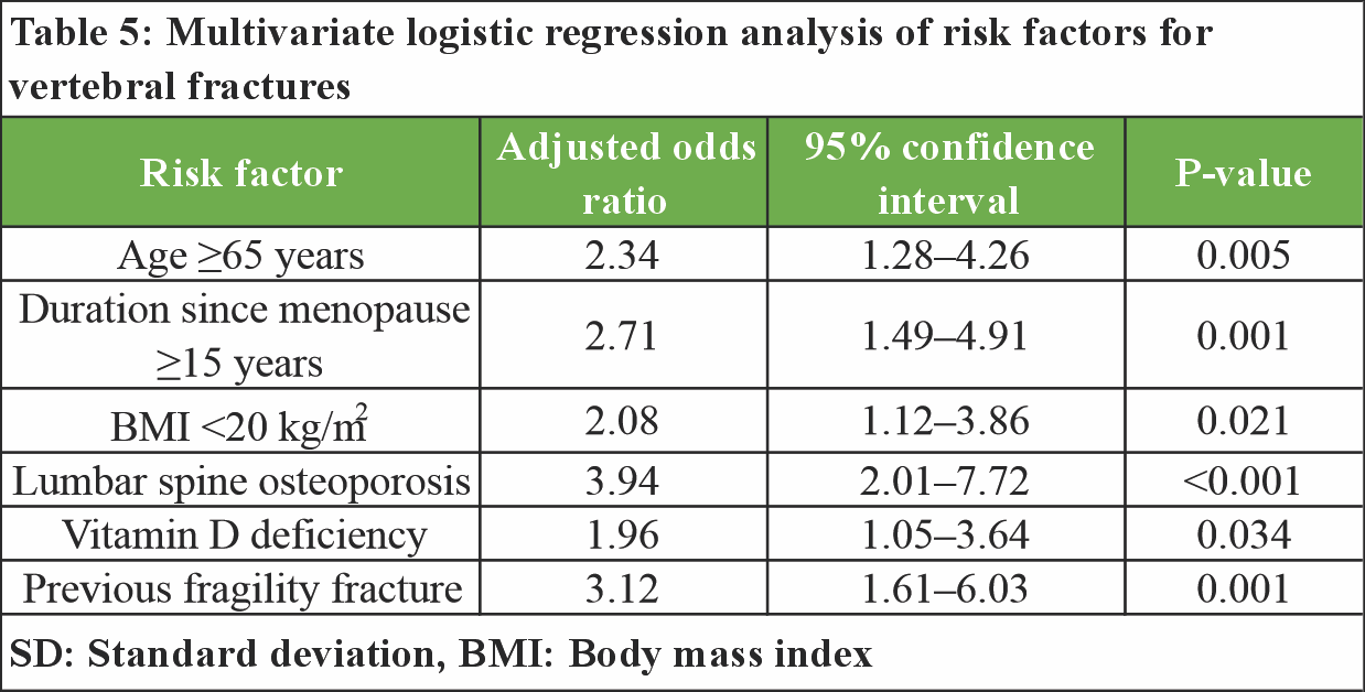 Vitamin D deficiency was more prevalent among women with vertebral fractures than among those without fractures (76.3% vs. 54.2%; P = 0.002). A history of prior fragility fracture was strongly associated with present vertebral fractures (42.1% vs. 13.9%; P < 0.001). Physical inactivity was also more common in the fracture group (73.7%) compared to the non-fracture group (54.2%; P = 0.006) (Table 4). Multivariate logistic regression analysis identified several independent predictors of vertebral fractures, including age ≥65 years (adjusted odds ratio [AOR] 2.34; 95% confidence interval [CI]: 1.28–4.26), duration since menopause ≥15 years (AOR 2.71; 95% CI: 1.49–4.91), BMI <20 kg/m2 (AOR 2.08; 95% CI: 1.12–3.86), and lumbar spine osteoporosis (AOR 3.94; 95% CI: 2.01–7.72). Vitamin D deficiency (AOR 1.96; 95% CI: 1.05–3.64) and a previous fragility fracture (AOR 3.12; 95% CI: 1.61–6.03) remained significantly associated with vertebral fractures after adjustment for potential confounders (Table 5).
