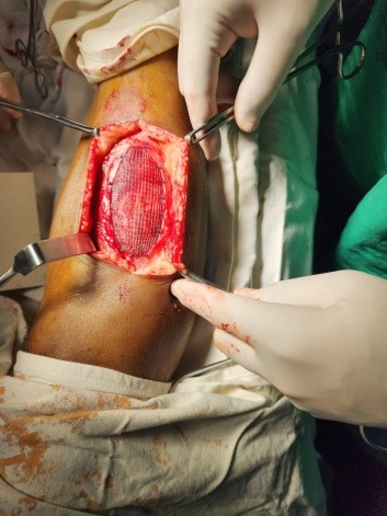 After reduction of the muscle, primary closure was deemed unsafe due to the size of the defect. A Prolene mesh was placed over the defect and secured to the surrounding healthy fascia using non-absorbable sutures, ensuring a tension-free repair (Fig. 3).