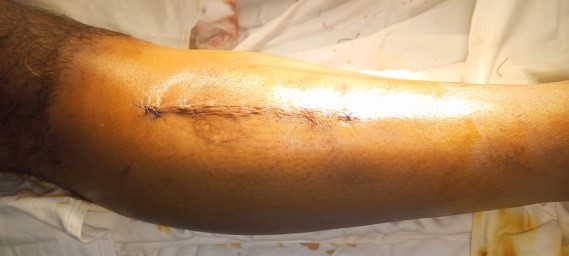 Conclusion: The defect was successfully managed using a Prolene mesh for tension-free repair. At the 6-month follow-up, the patient was asymptomatic with no recurrence or complications. This case highlights Prolene mesh repair as a reliable option for large traumatic fascial defects.