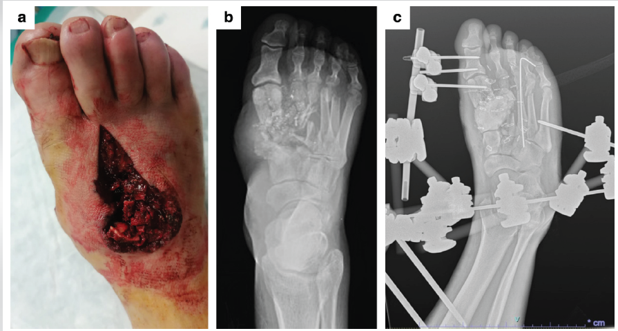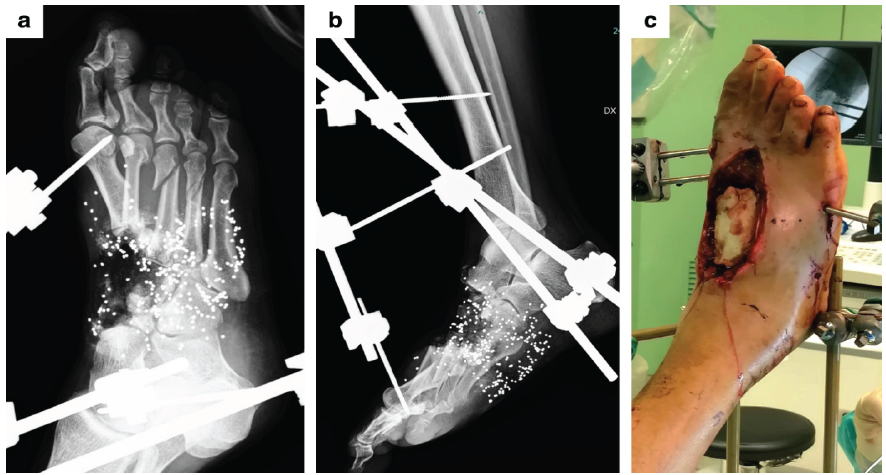 A 67-year-old male hunter was admitted to Sant’Anna Hospital in Como with a composite right foot injury sustained during a boar hunting accident at close range (50 cm) involving a high-velocity rifle projectile. The soft-tissue defect measured 25 cm2 dorsally and 24 cm2 plantarly. Radiological evaluation revealed loss of the base and diaphysis of the first metatarsal, fracture of the first metatarsal head, loss of the base and diaphysis of the second metatarsal, fractures of the third and fourth metatarsals, and fracture of the proximal phalanx of the third toe. CT angiography demonstrated patency of the posterior tibial, anterior tibial, and peroneal arteries, with interruption of the dorsalis pedis artery at the base of the second metatarsal. An antibiotic regimen (amoxicillin, gentamicin, and metronidazole) was initiated immediately. Urgent debridement was performed, with removal of devitalized bone fragments from the first and second rays. Osteosynthesis of the third metatarsal was achieved using an intramedullary K-wire, and stabilization was provided with a Hoffmann 3 (Stryker) external fixator spanning from the distal tibia to the calcaneal tuberosity and the fifth metatarsal (Fig. 4).