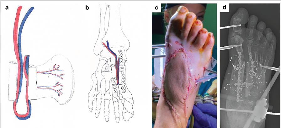 A 61-year-old male hunter was transferred to Sant’Anna Hospital in Como (Italy) from an orthopedic center in Croatia, where he had been treated 1 week earlier with local debridement and provisional external fixation following a short-distance (50 cm) smoothbore shotgun injury to the right foot during a hunting accident. On admission, the patient presented with a dorsal soft-tissue defect measuring 35 cm2 and a plantar defect of 18 cm2. X-rays revealed extensive bone loss, including the first, second, and third cuneiforms, the navicular bone, and the bases of the first and second metatarsals. Fractures of the third and fourth metatarsals and the proximal phalanx of the great toe were also observed, along with retention of multiple lead pellets. Computed tomography (CT) angiography showed no significant vascular damage, with patency of the anterior tibial, posterior tibial, interosseous, and dorsalis pedis arteries. Immediate local debridement and removal of visible lead pellets were performed, followed 2 days later by a second-look procedure. This included removal of devitalized bone fragments from the navicular, metatarsals, and cuneiform bones, removal of the previously applied external fixator, and stabilization with a Hoffmann 3 (Stryker) external fixator spanning from the distal tibia to the rearfoot (calcaneal tuberosity) and forefoot (first and fifth metatarsals). Gentamicin-loaded bone cement (Refobacin Bone Cement R, Zimmer Biomet) was interposed into the bone defects, covered with a reverse sural artery pedicle flap (Fig. 1). Vacuum-assisted closure (VAC) therapy was also applied.