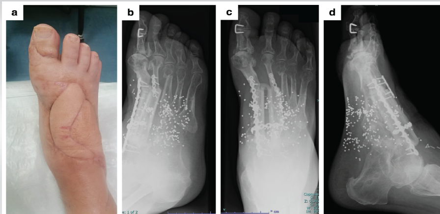 Figure 3: 24-month follow-up in Case 1. (a) Clinical photograph showing skin condition. (b-d) X-rays of the foot.