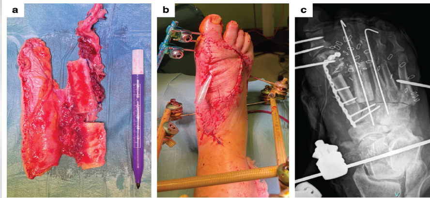 Introduction: Gunshot injuries to the foot can result in complex composite defects requiring comprehensive reconstructive strategies to restore both bony architecture and soft-tissue integrity. These injuries pose significant challenges due to extensive tissue destruction and the need for vascularized bone transfer.