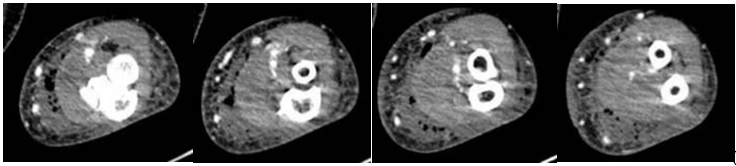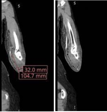 Figure 1: Coronal (a) and axial (b) Computed tomography images of the left forearm demonstrating an extensive subcutaneous fluid collection measuring 3.2 × 10.5 cm and a gas pattern consistent with necrotizing soft-tissue infection. Images progress from proximal to distal.